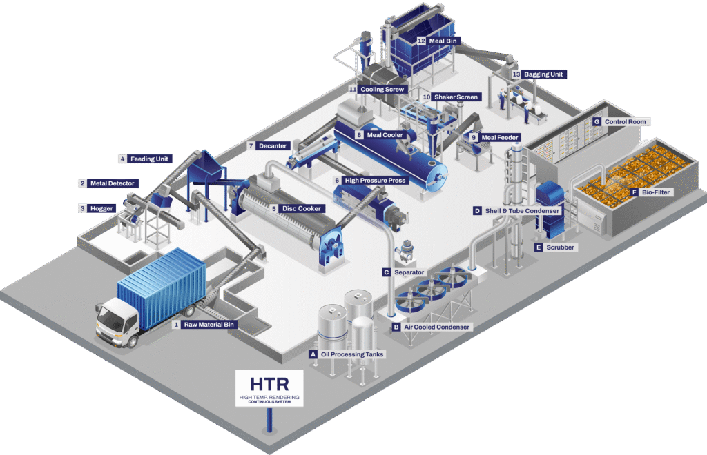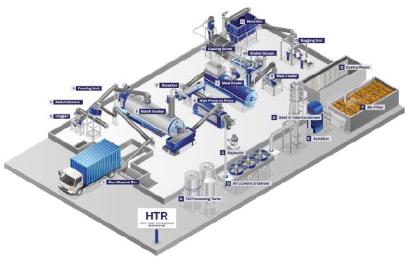 A High Temperature Rendering (HTR) Plant is a facility that processes animal by-products (such as offal, bone, and fat) by applying high heat for a significant period of time to sterilize the material, evaporate moisture, and separate the fat from the protein solids.