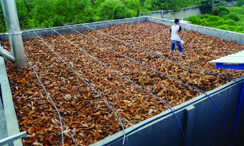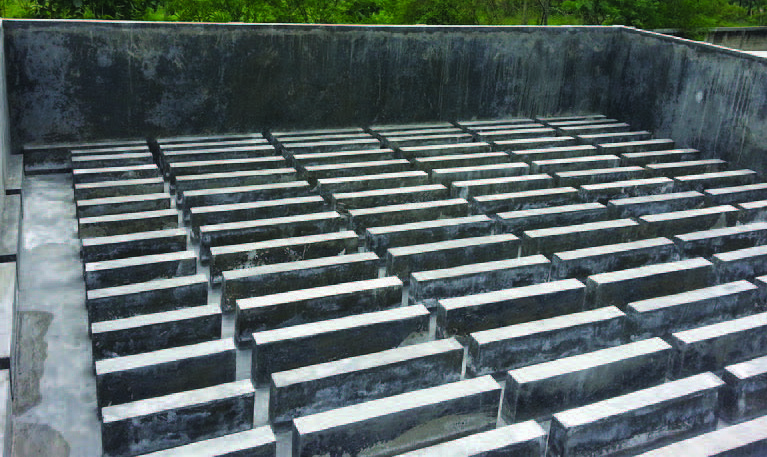 The design is normally a large (typically 10 x 20 x 2 meters or much larger) basin like a “swimming pool” where the smelly rest gas is slowly filtered from the bottom through a layer of moist “bio media” like coconut husks, tree (pine) bark, rice husk or similar bio materials after having been cooled down and condensed to less than 40 deg C.
