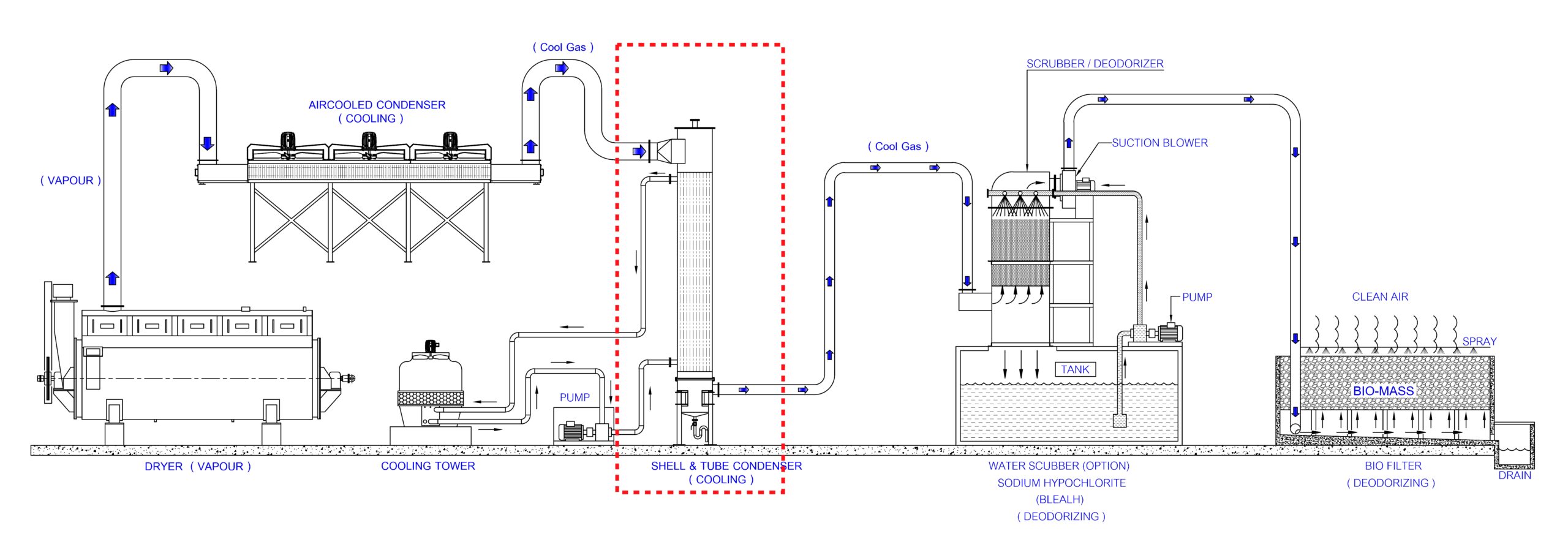 The ASTW shell & tube condenser sues cooled water that surround stainless tubes to condense waste vapour running inside the tubes.