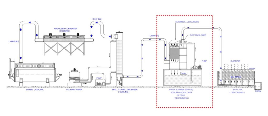 If a high volume of water from sea or river is available, it is possible to use a water scrubber as the only condensation and smell removal method, volume about 45 m3 water per one ton of plant capacity.